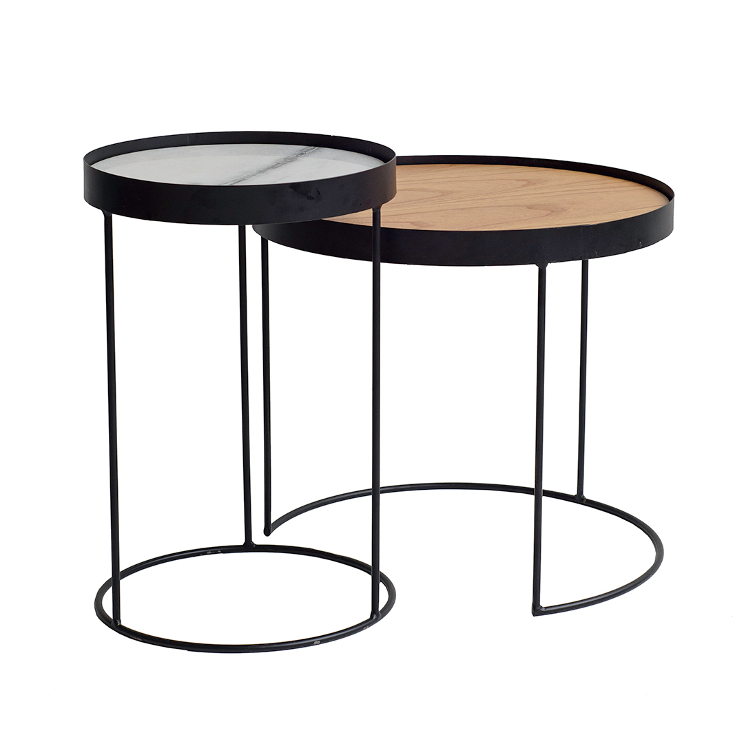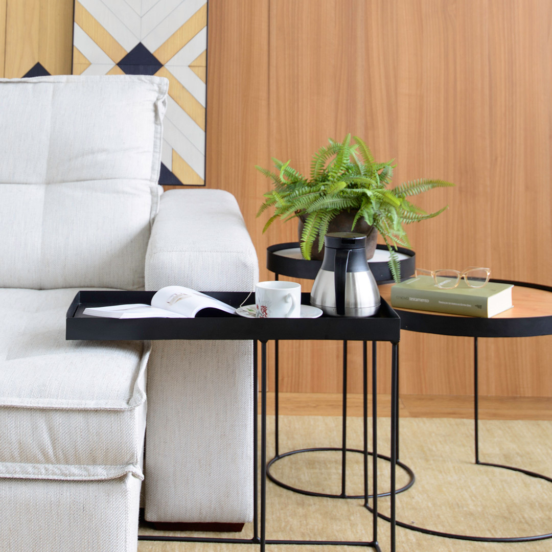 Descrição: O Conjunto Riva é composto por três mesas, mesa lateral Riva 35 com sua estrutura em ferro preto fosco e tampo em pedra branca, mesa lateral Riva 50 com sua estrutura em ferro preto fosco e tampo dupla face em laminada de madeira e Laca preto fosco e a mesa lateral Encaixe Riva com sua estrutura em ferro preto fosco e tampo em Laca preto fosco dá um toque minimalista para o visual do seu ambiente.