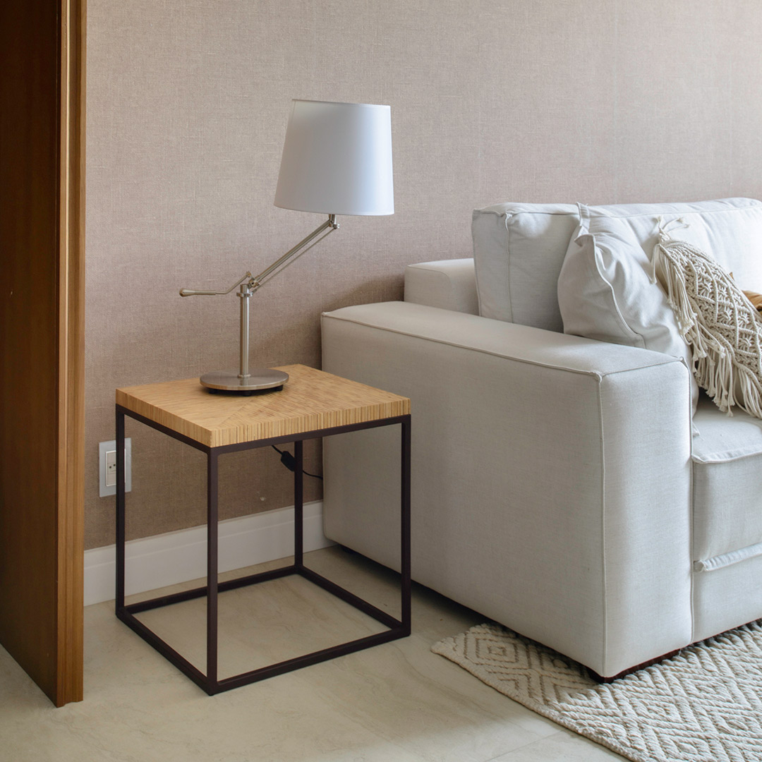 Descrição: Mesa Lateral com tampo bem estruturado e desenvolvido em compensado com a técnica em Marchetaria, encaixe de peça por peça, com a estrutura em ferro preto fosco é ótimo para compor mesa centro, lateral ou mesmo funcionar como banco.