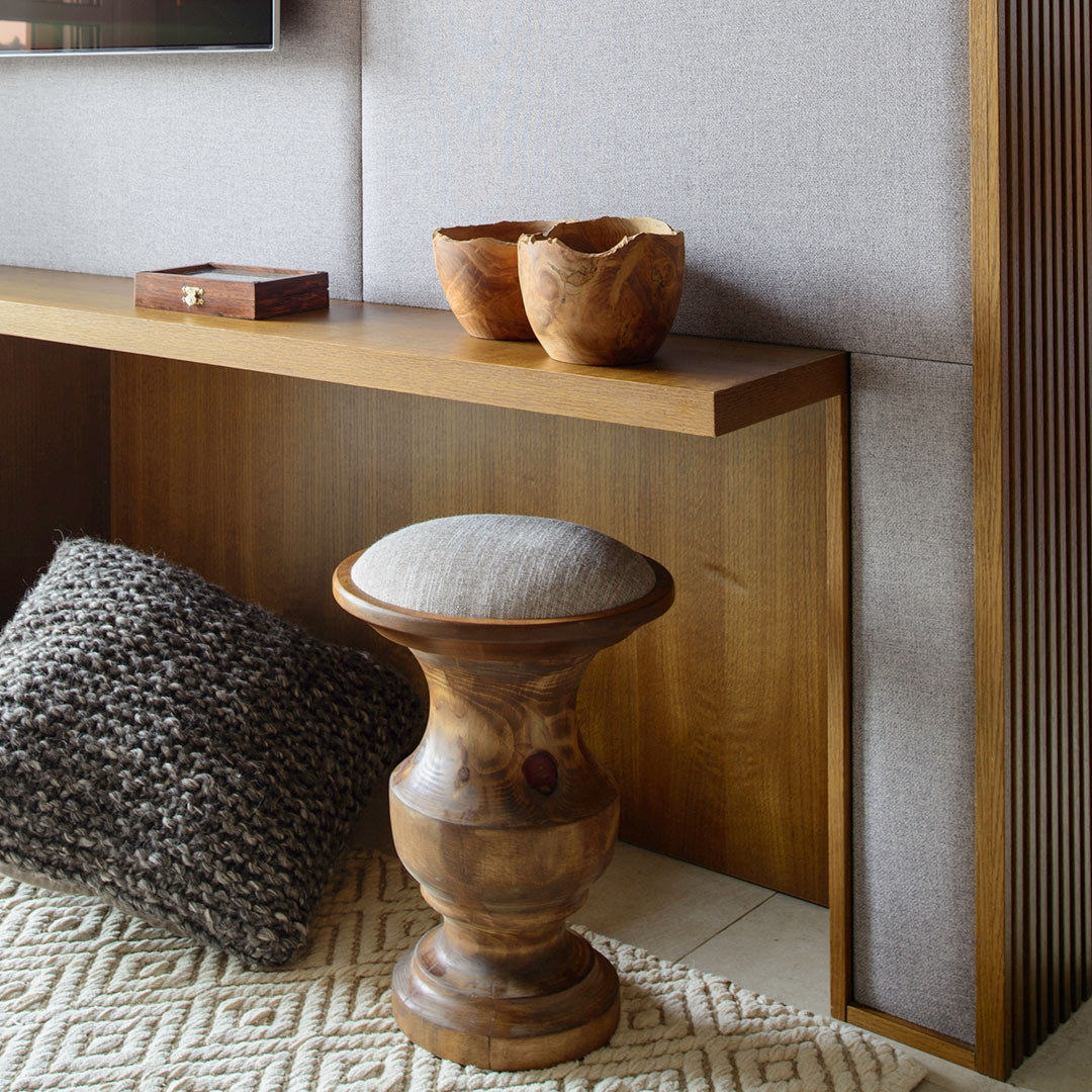 Descrição: O Banco Cabernet é um banco em tora natural com manejo sustentável, seguindo a rigor os protocolos dos órgãos reguladores e assento em tecido. Valorizamos nesta série de móveis as texturas e desenhos naturais da madeira, realçando sua originalidade com design único para sua casa. Material: Madeira Itaubá de manejo sustentável e estofado em tecido linho na cor grafite. Medidas: 30 x 42 x 30cm (LxAxP). Designer: Rafael Borges.