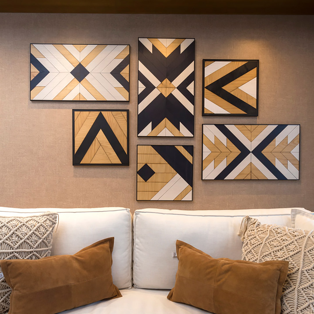 Descrição: Confeccionado com técnica marchetaria em folha de madeira de carvalho americano, tingimento e uma moldura ultra fina em alumínio preto fosco, os quadros da linha Etnias valoriza as diversas expressões de arte étnica garimpada mundo afora. Material: MDF carvalho americano, MDF tingido em branco e MDF tingido em preto, usinado a laser, colado em fundo de MDF preto texturizado e moldura em alumínio preto com acabamento 45° nos cantos. Medidas: 40 x 70 cm. Designer: Rafael Borges.