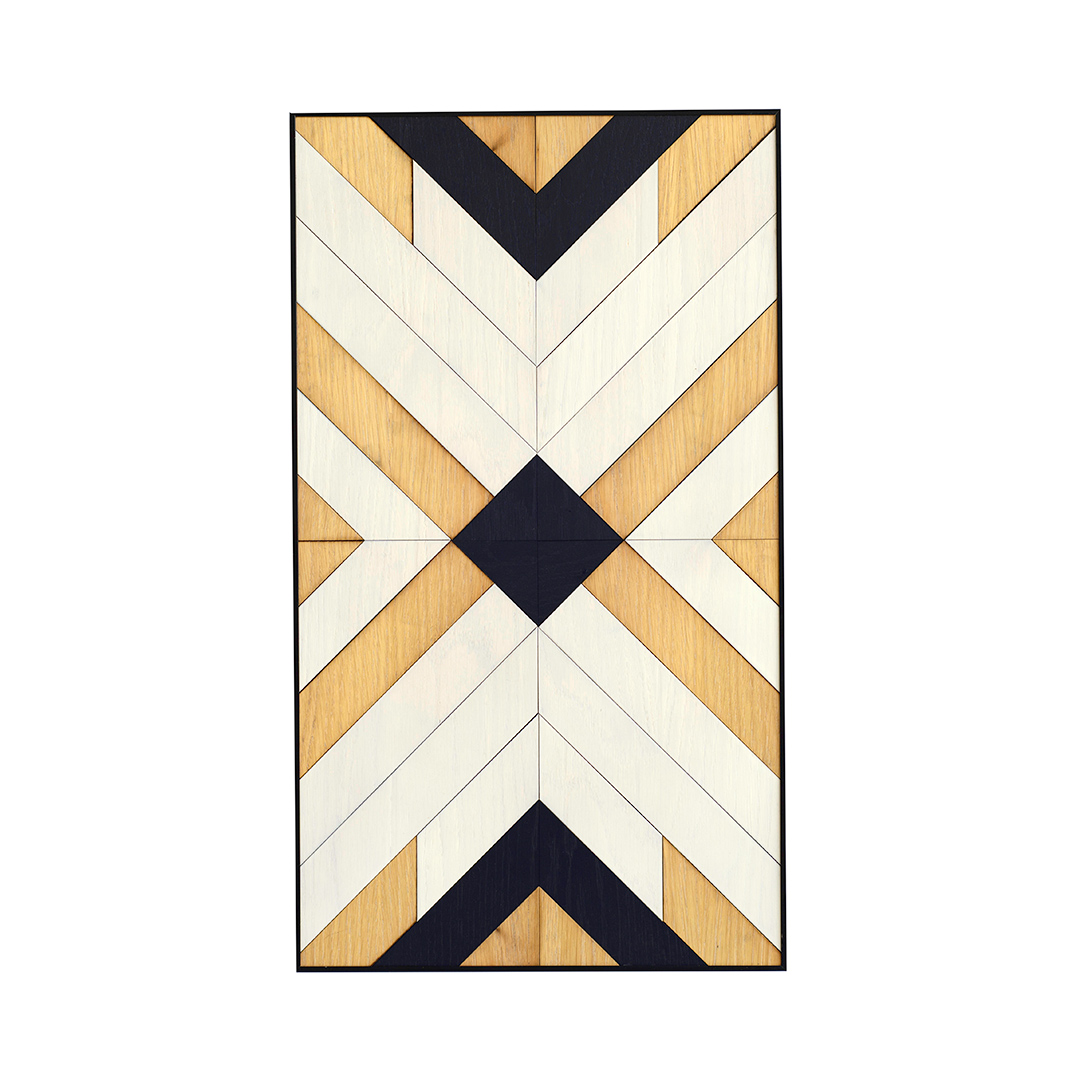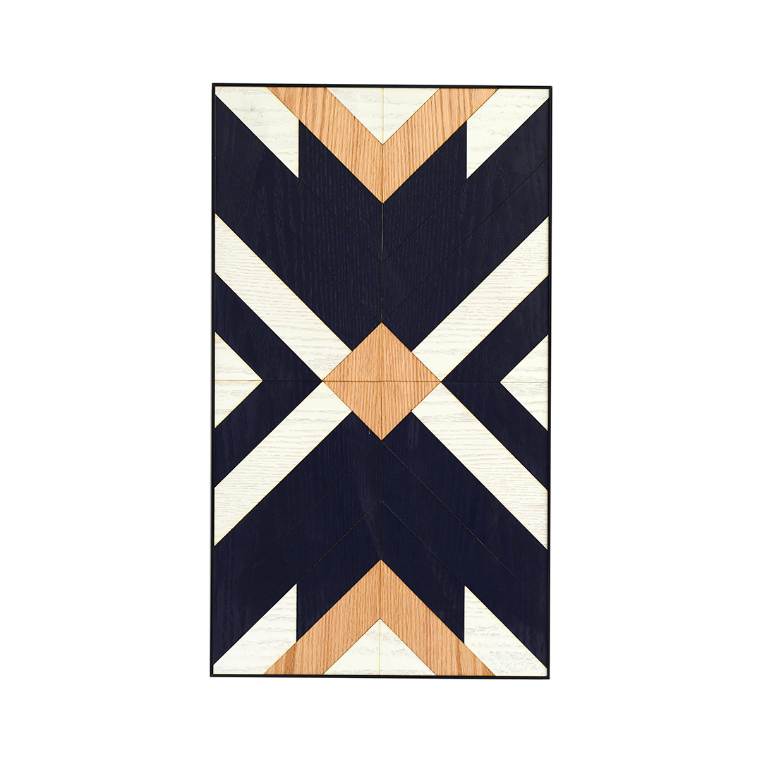 Descrição: Confeccionado com técnica marchetaria em folha de madeira de carvalho americano, tingimento e uma moldura ultra fina em alumínio preto fosco, os quadros da linha Etnias valoriza as diversas expressões de arte étnica garimpada mundo afora. Material: MDF carvalho americano, MDF tingido em branco e MDF tingido em preto, usinado a laser, colado em fundo de MDF preto texturizado e moldura em alumínio preto com acabamento 45° nos cantos. Medidas: 40 x 70 cm. Designer: Rafael Borges.