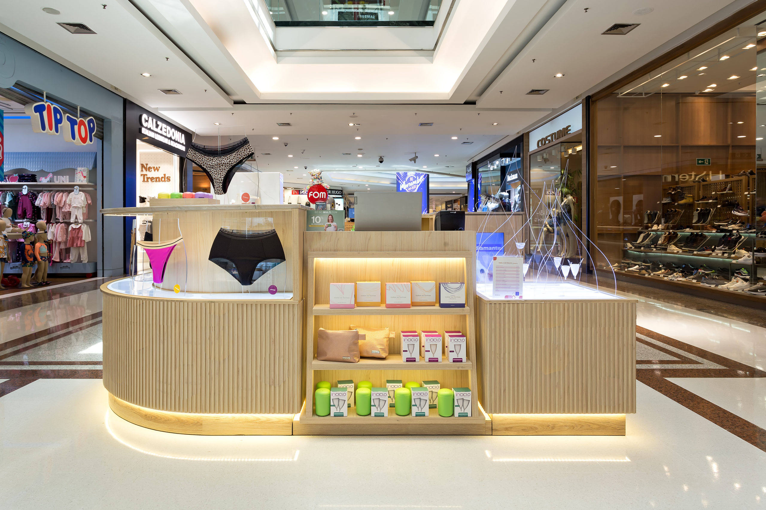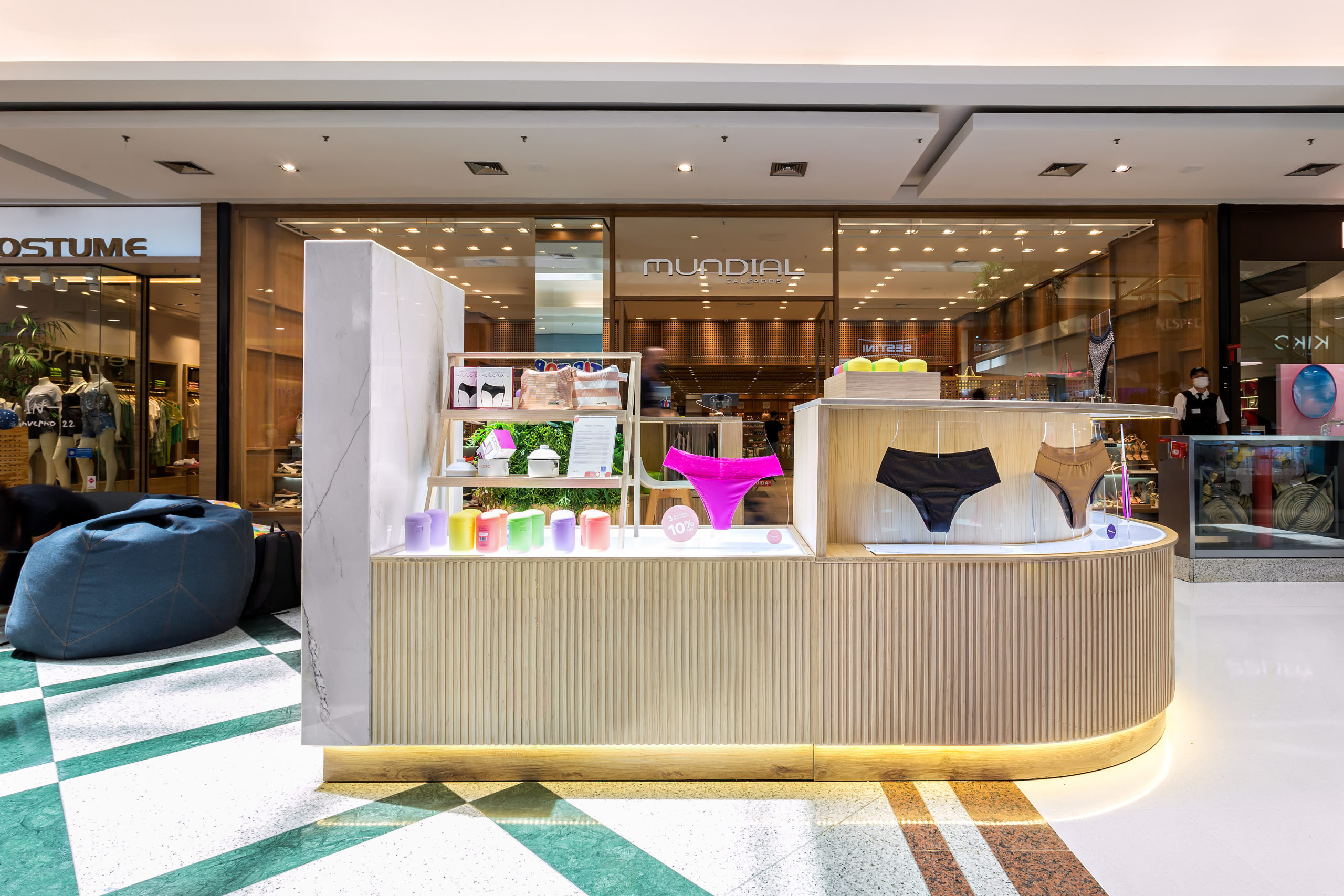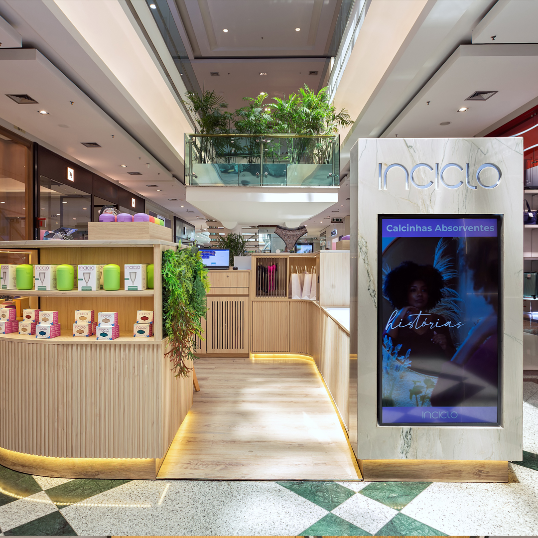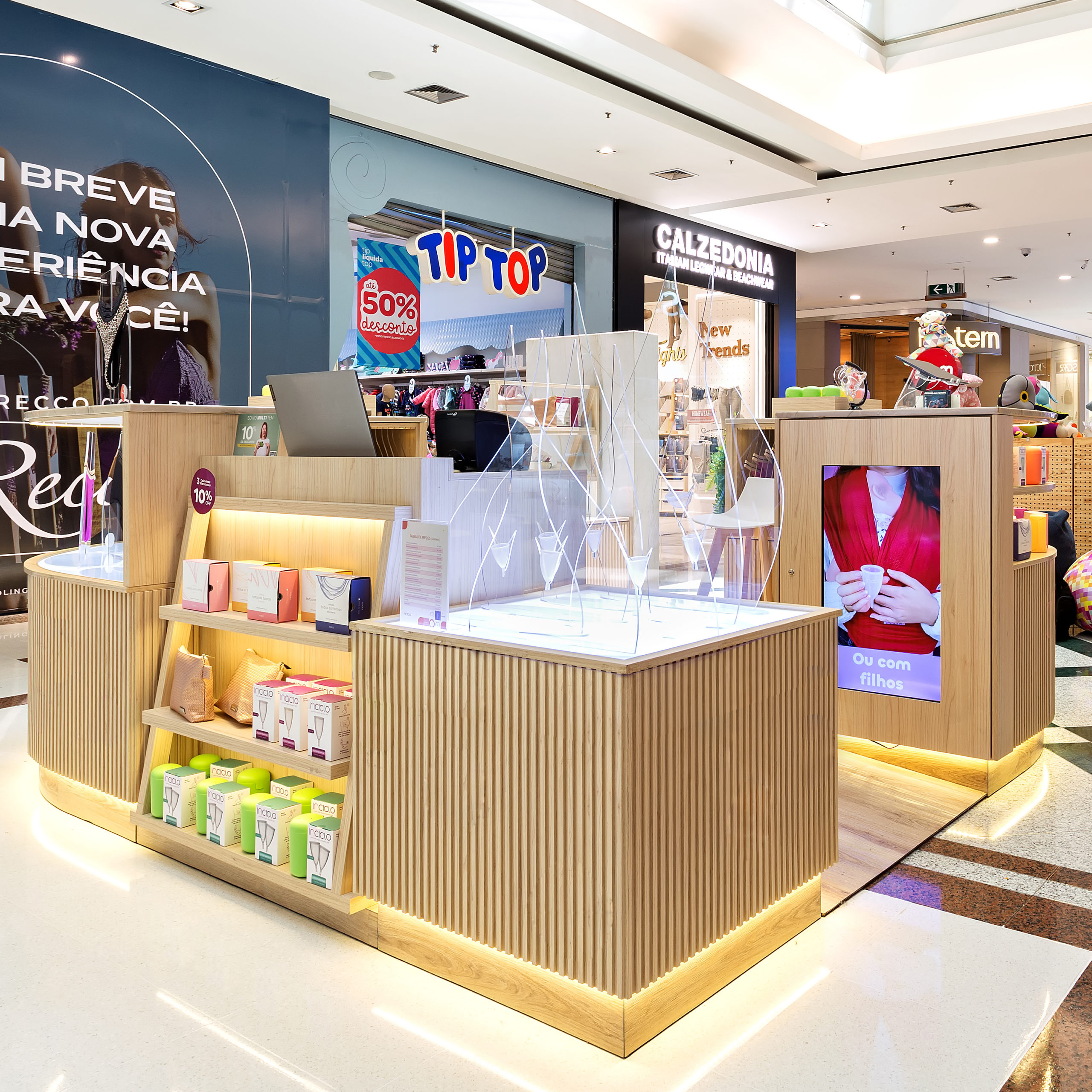 Descrição: Quiosque com tampo em mármore branco rajado e marcenaria em MDF laminado. Parte interna com portas e expositores frente e verso iluminados com fita de led. Balcão Caixa possuindo gaveta e portas com chave, área externa com expositor de produtos através de cavalete de madeira e prateleiras. Os expositores para esculturas de acrílico de 8mm apoiada base backlight, com iluminação focada. Tabelado em compensado naval com revestimento em piso vinílico de alto impacto, apresentando 2 rampas para acesso de clientes. Totem com logomarca retroiluminada usinada frente e verso e espaço para TV de 40" voltada para área externa. Jardim vertical com plantas permanentes medindo.