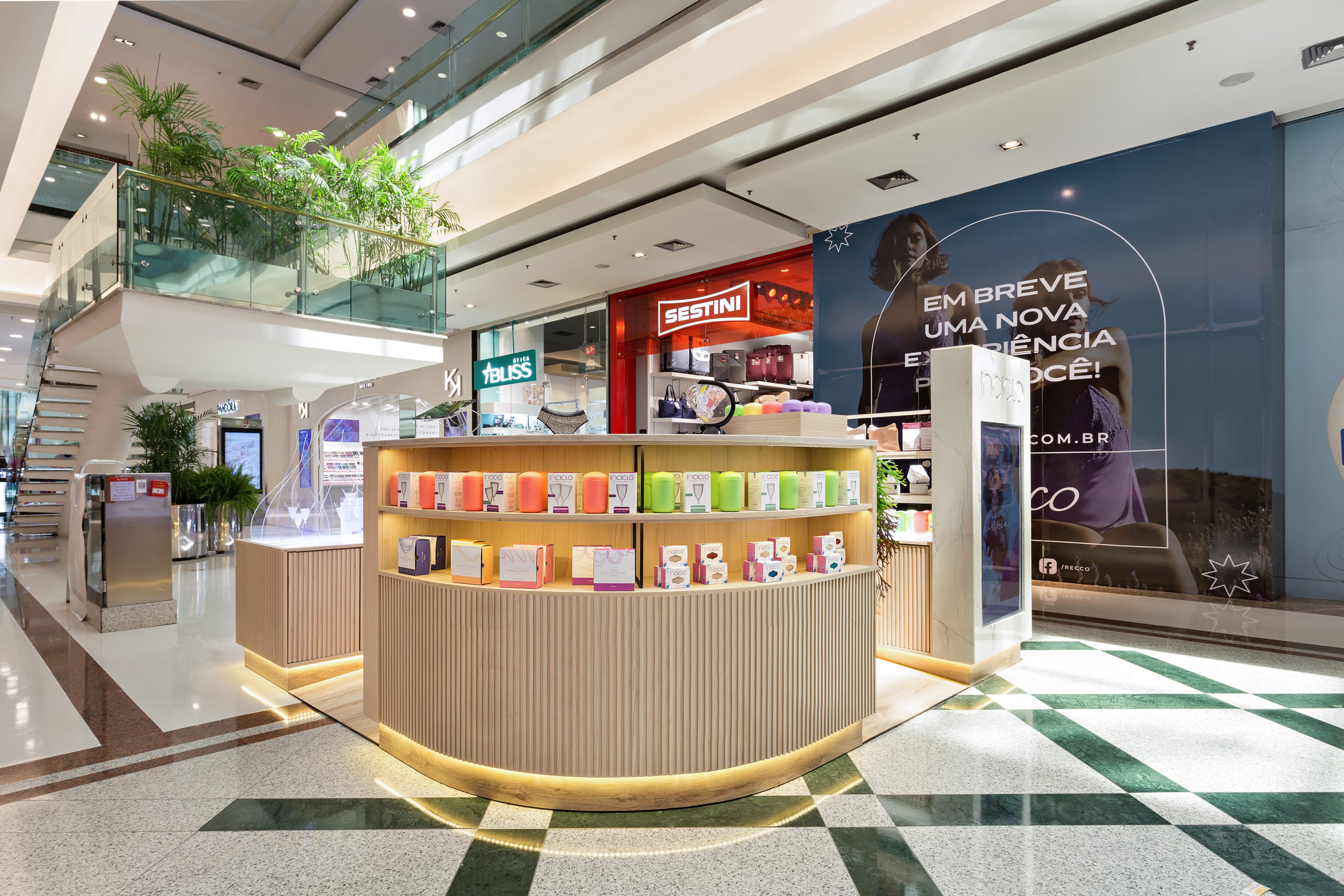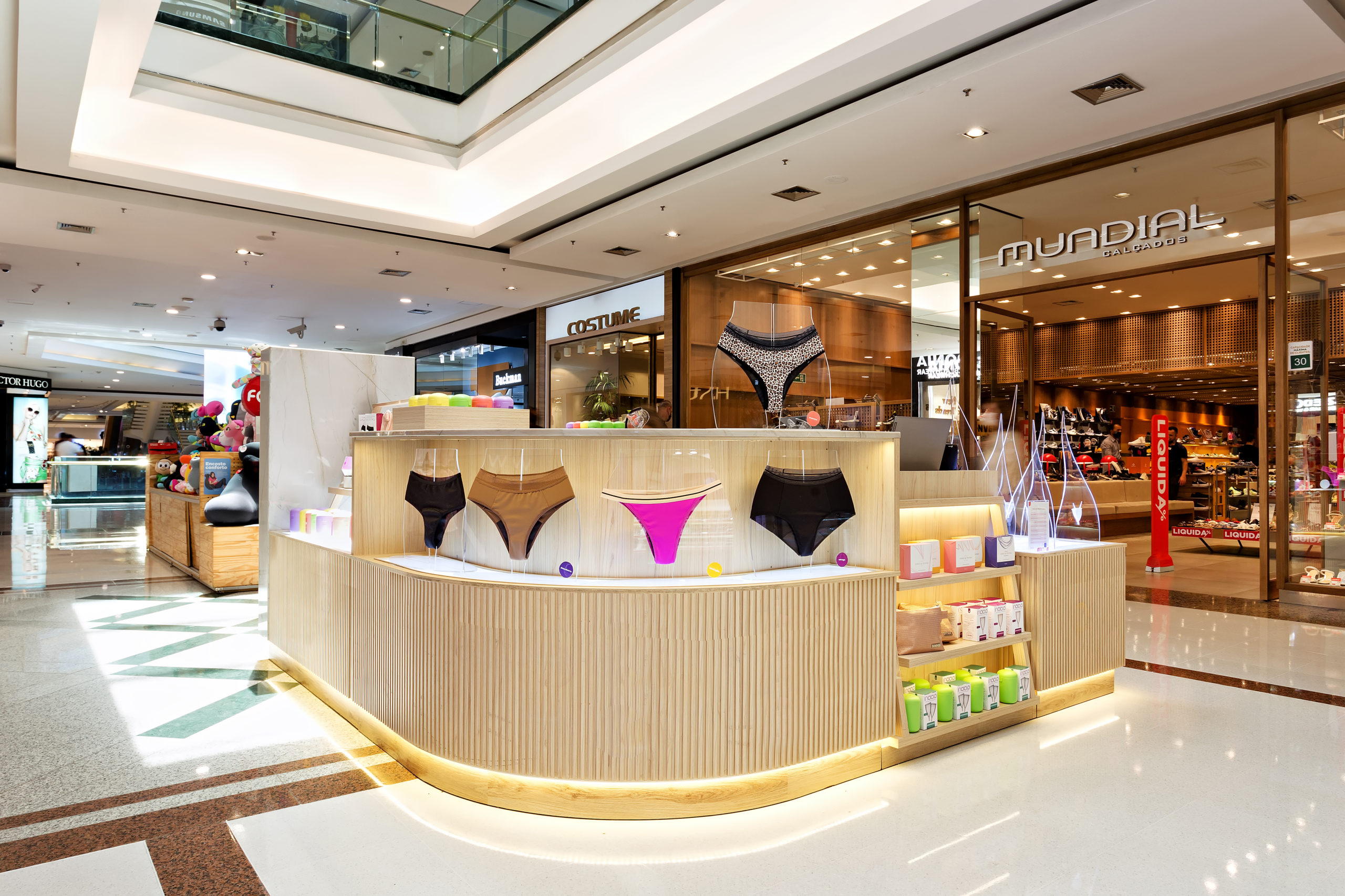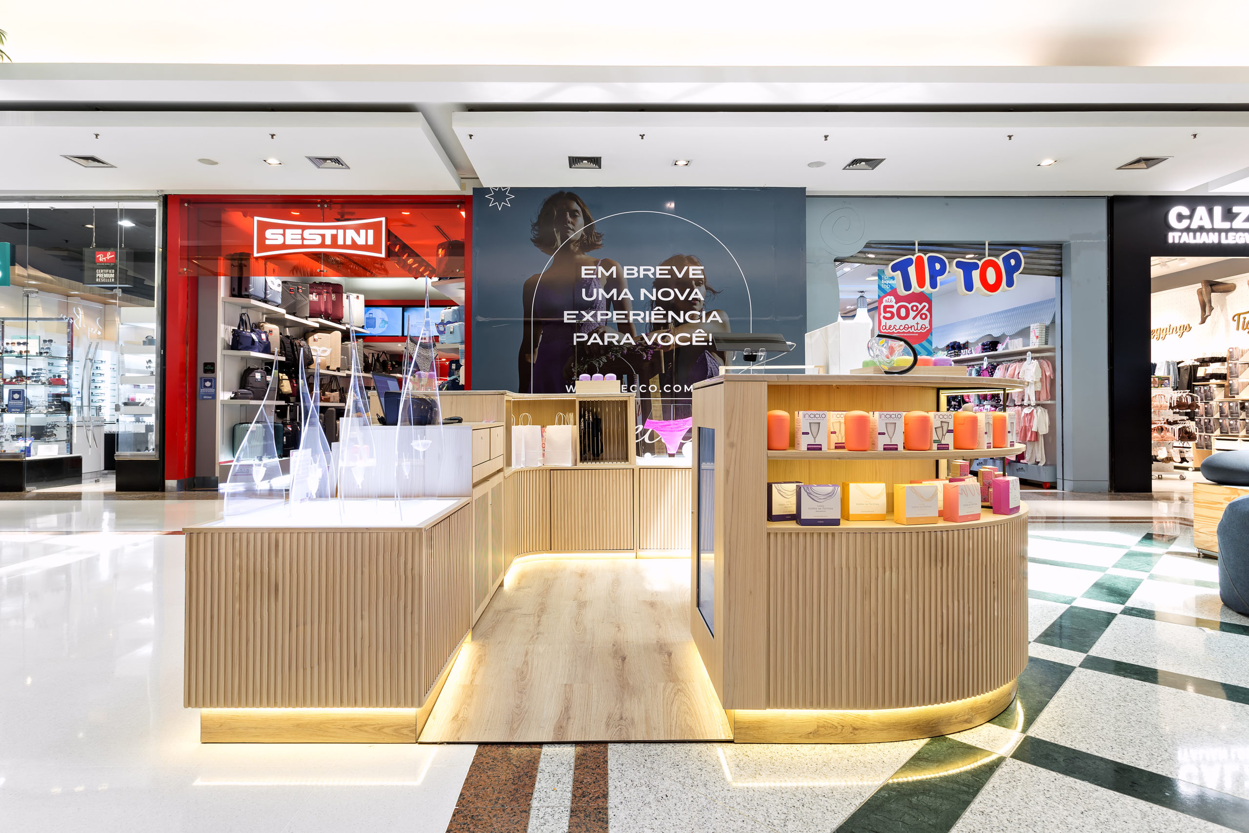 Descrição: Quiosque com tampo em mármore branco rajado e marcenaria em MDF laminado. Parte interna com portas e expositores frente e verso iluminados com fita de led. Balcão Caixa possuindo gaveta e portas com chave, área externa com expositor de produtos através de cavalete de madeira e prateleiras. Os expositores para esculturas de acrílico de 8mm apoiada base backlight, com iluminação focada. Tabelado em compensado naval com revestimento em piso vinílico de alto impacto, apresentando 2 rampas para acesso de clientes. Totem com logomarca retroiluminada usinada frente e verso e espaço para TV de 40" voltada para área externa. Jardim vertical com plantas permanentes medindo.