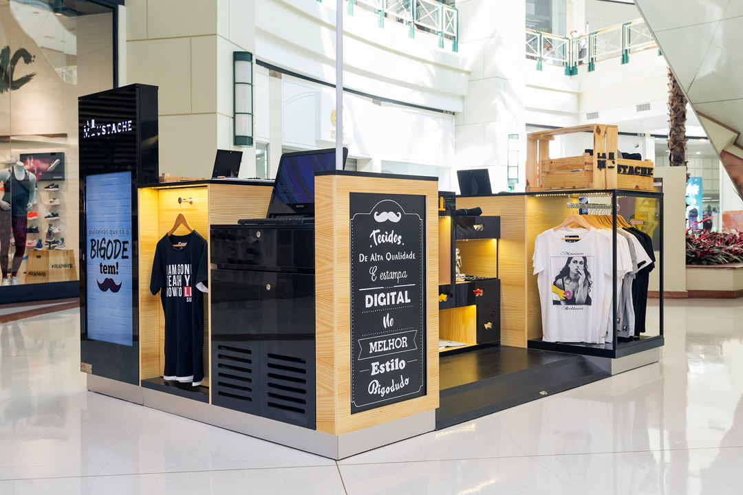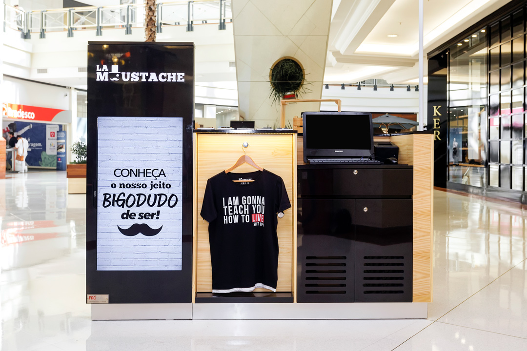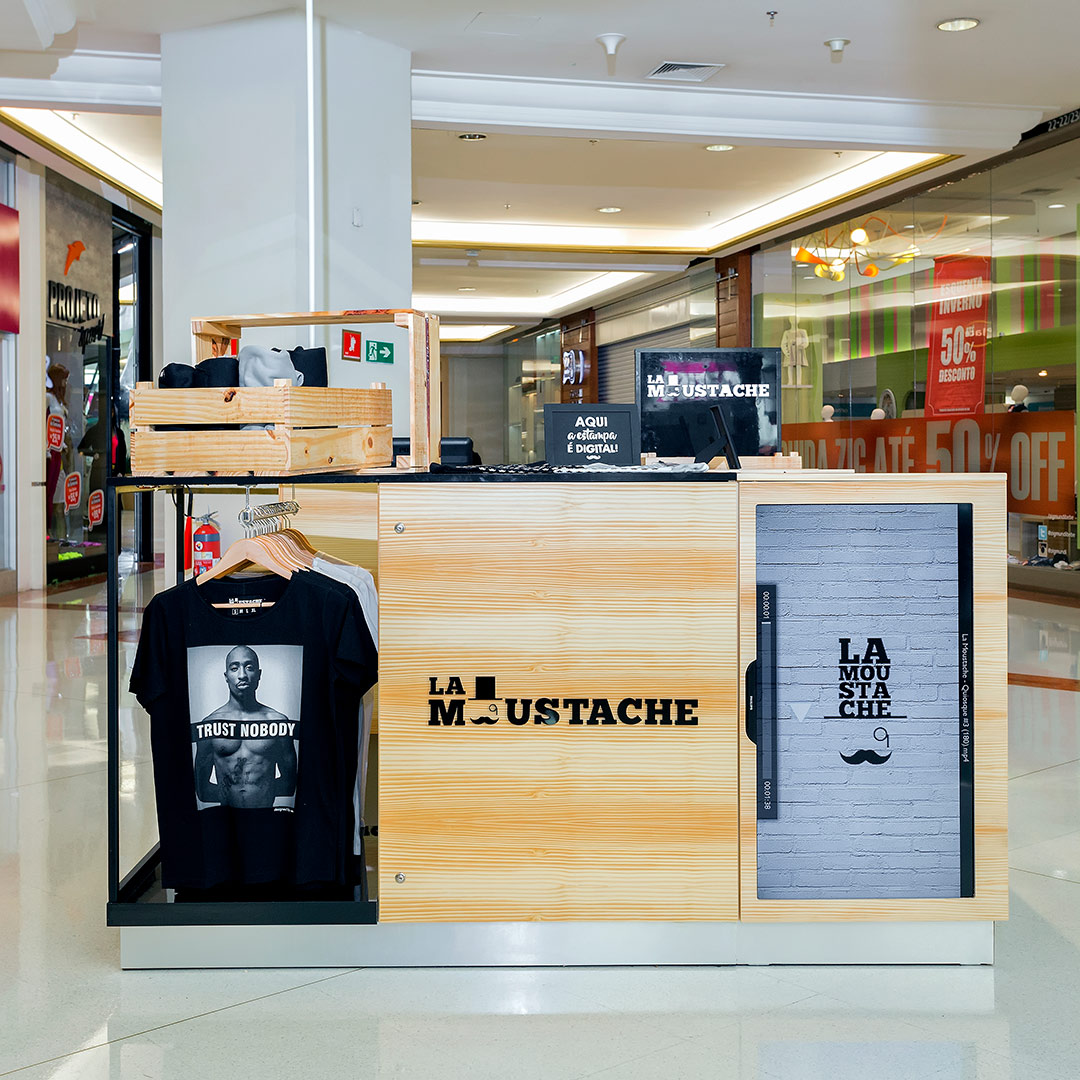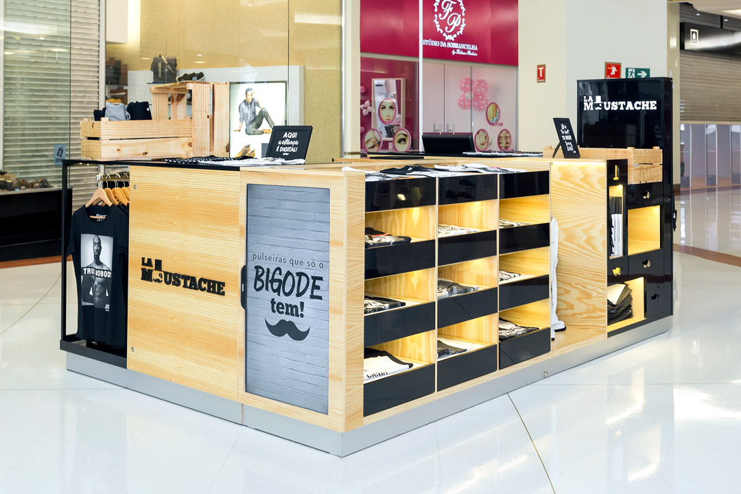 Descrição: Quiosque desenvolvido em madeira pinus, contendo: gavetas em MDF preto com acrílico translucido leitoso e iluminação interna, balcão caixa com losa em baixo relevo na lateral, totem com logo usinado em baixo relevo com iluminação indireta e TV embutida, araras para exposição de camisetas, logo em MDF usinado em alto relevo, expositor de pulseiras em acrílico branco leitoso e caixas rusticas para exposição de produtos.