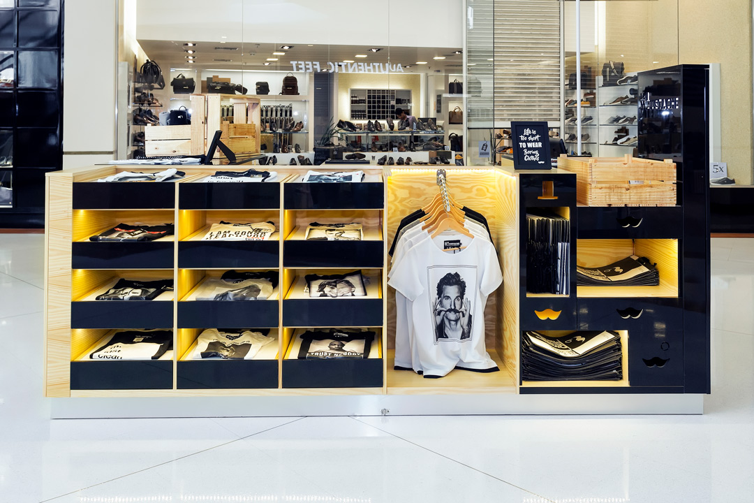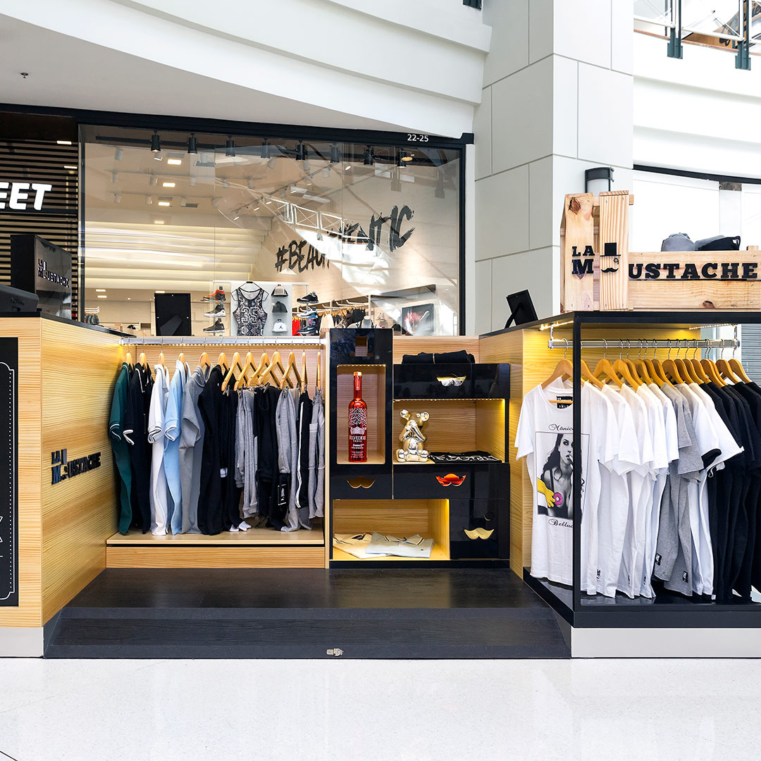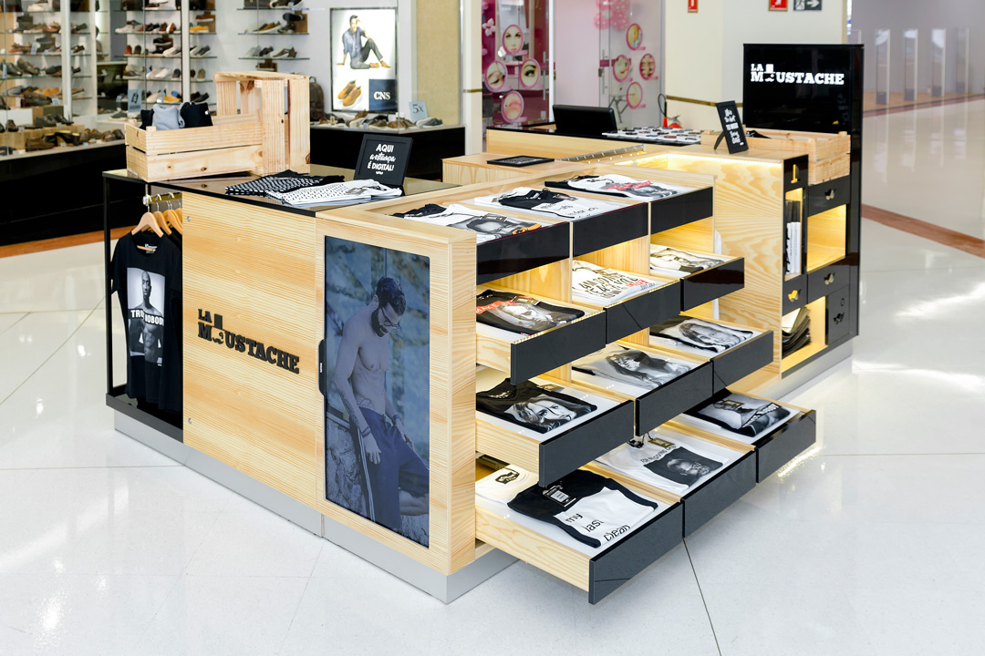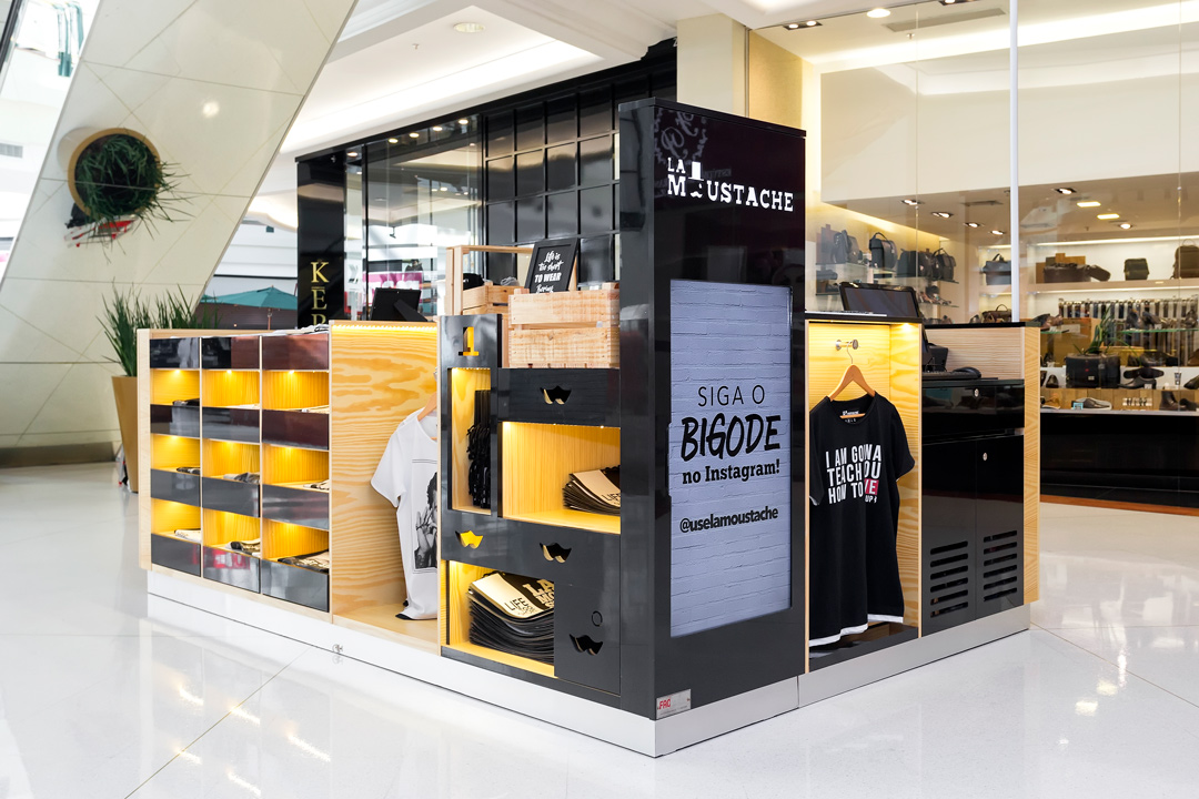 Descrição: Quiosque desenvolvido em madeira pinus, contendo: gavetas em MDF preto com acrílico translucido leitoso e iluminação interna, balcão caixa com losa em baixo relevo na lateral, totem com logo usinado em baixo relevo com iluminação indireta e TV embutida, araras para exposição de camisetas, logo em MDF usinado em alto relevo, expositor de pulseiras em acrílico branco leitoso e caixas rusticas para exposição de produtos.