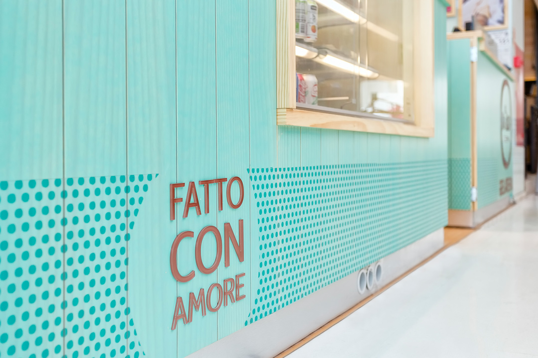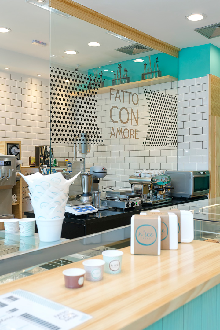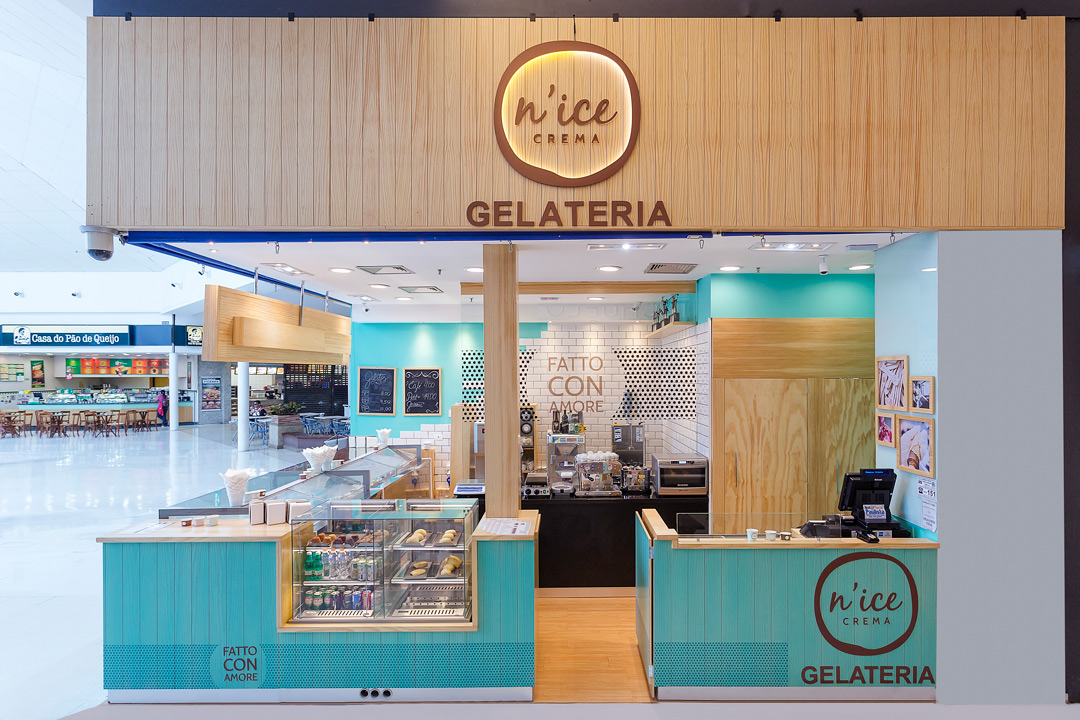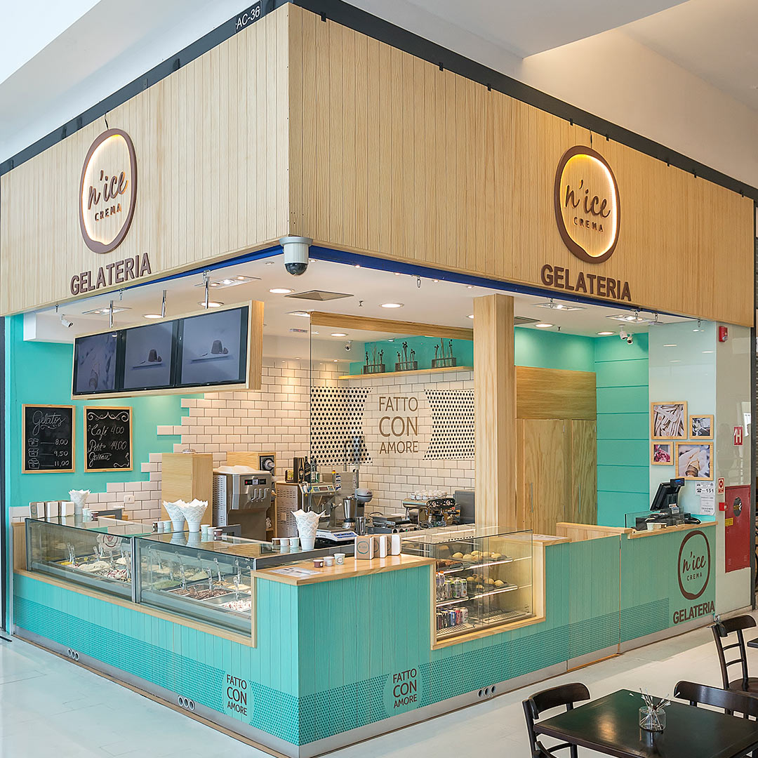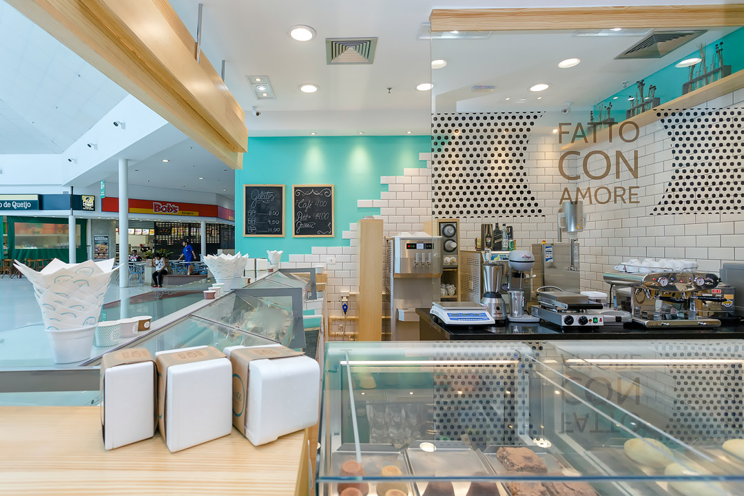 Descrição: Loja confeccionada parte interna com móveis de apoio, bancada para caixa, bancada para pia, armário para máquina de sorvetes em MDF madeirado. Parte externa dos móveis em madeira Pinus com tingimento azul. Parede com azulejos branco e pisos em PVC vinílico. Tampo em área molhada em granito Preto São Gabriel, vidro serigrafado preto com logo. Testeira em MDF com logomarca impressa em acrílico branco. Revestimento de coluna em vidro serigrafado azul. Testeira de informações em MDF com acrílico impresso e iluminação interna, quadros lousas em laminado lousa preto. Iluminação indireta com fitas de LED e iluminação geral da loja com luminárias embutidas no forro em metal branco e lâmpadas de LED.