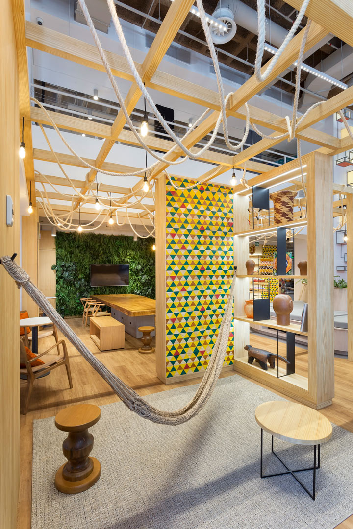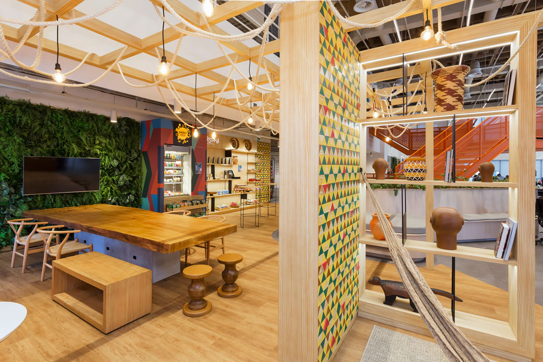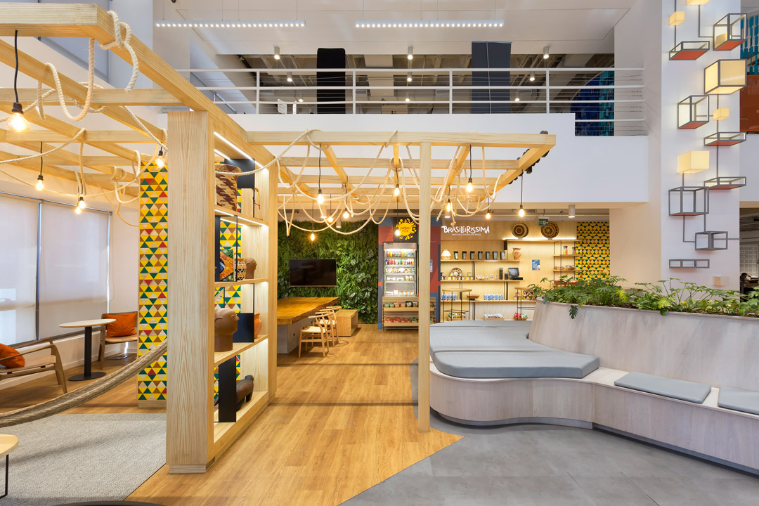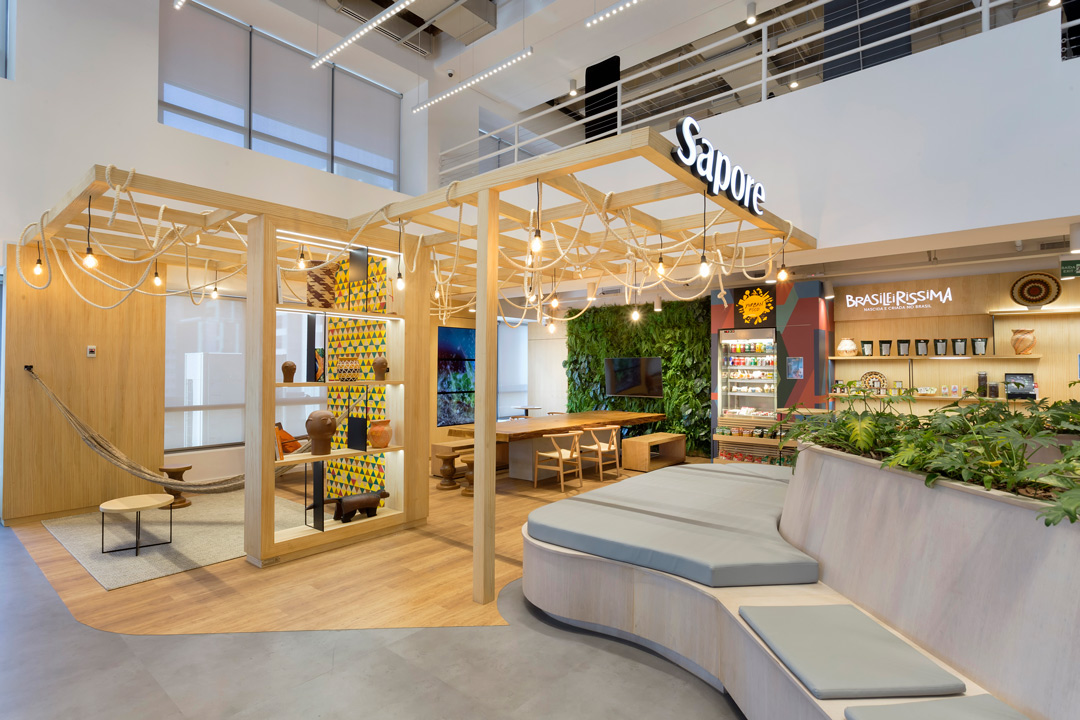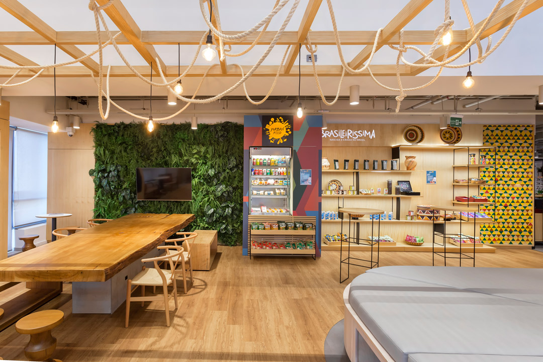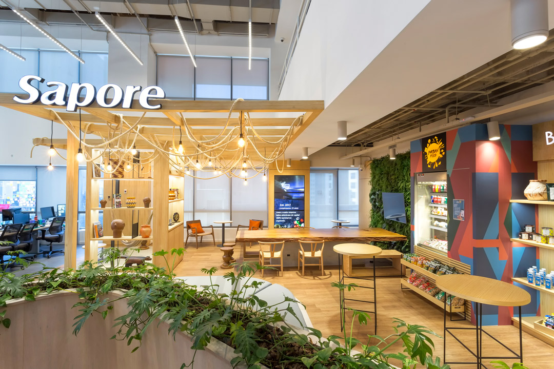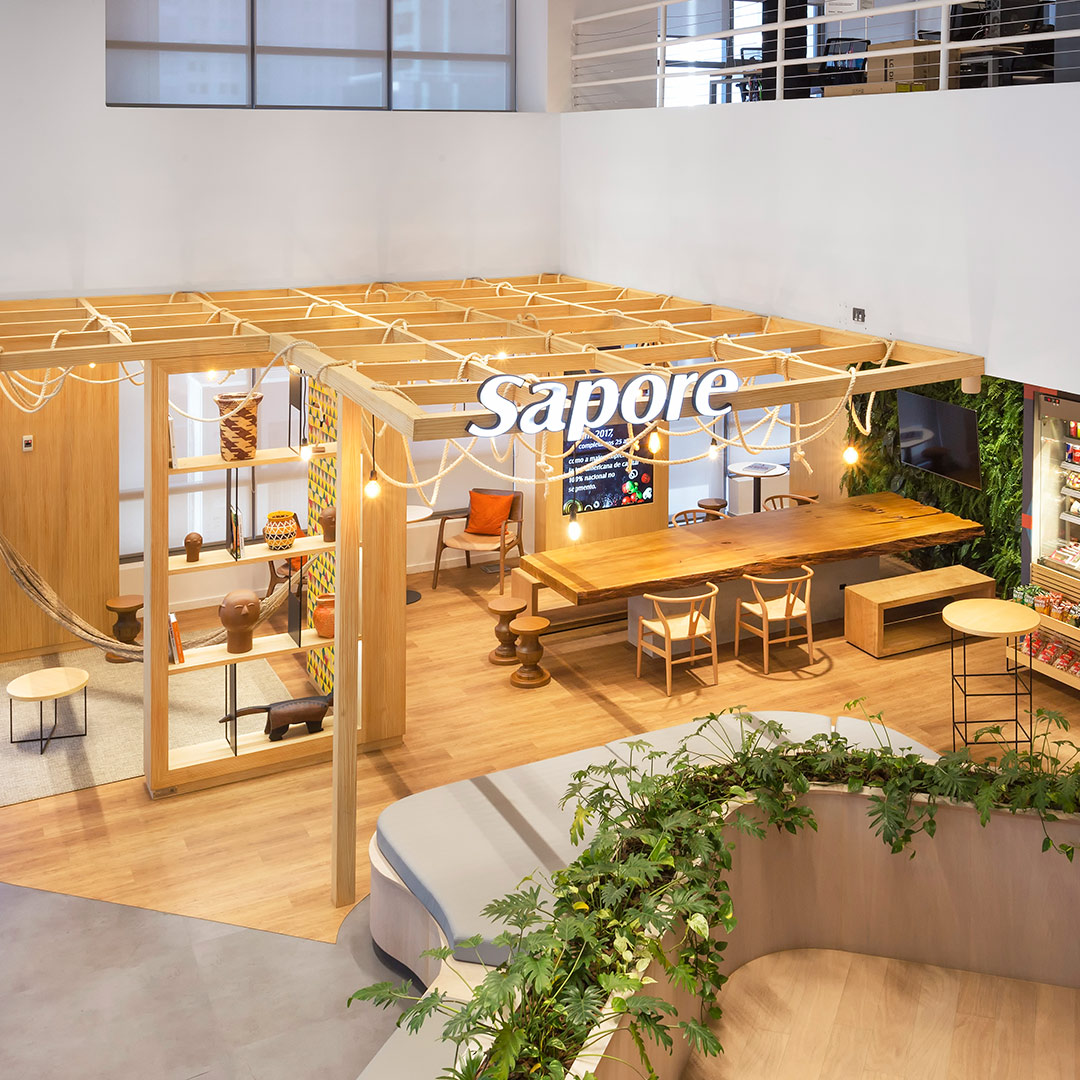 Descrição: Quiosque para Espaço Sapore criado com elementos em madeira Pinus envernizado. Possui móvel para fechamento de geladeira adesivada, paredes vertical verde, mesa tronco de árvore para coworking com estrutura metálica e fechamento em placa cimentícia. Logomarca usinada a laser com iluminação interna apoiada em pergolado com cordas e lâmpadas de filamento aparente, bancos torneados, tapete de sisal, rede, poltronas e mesas de canto.