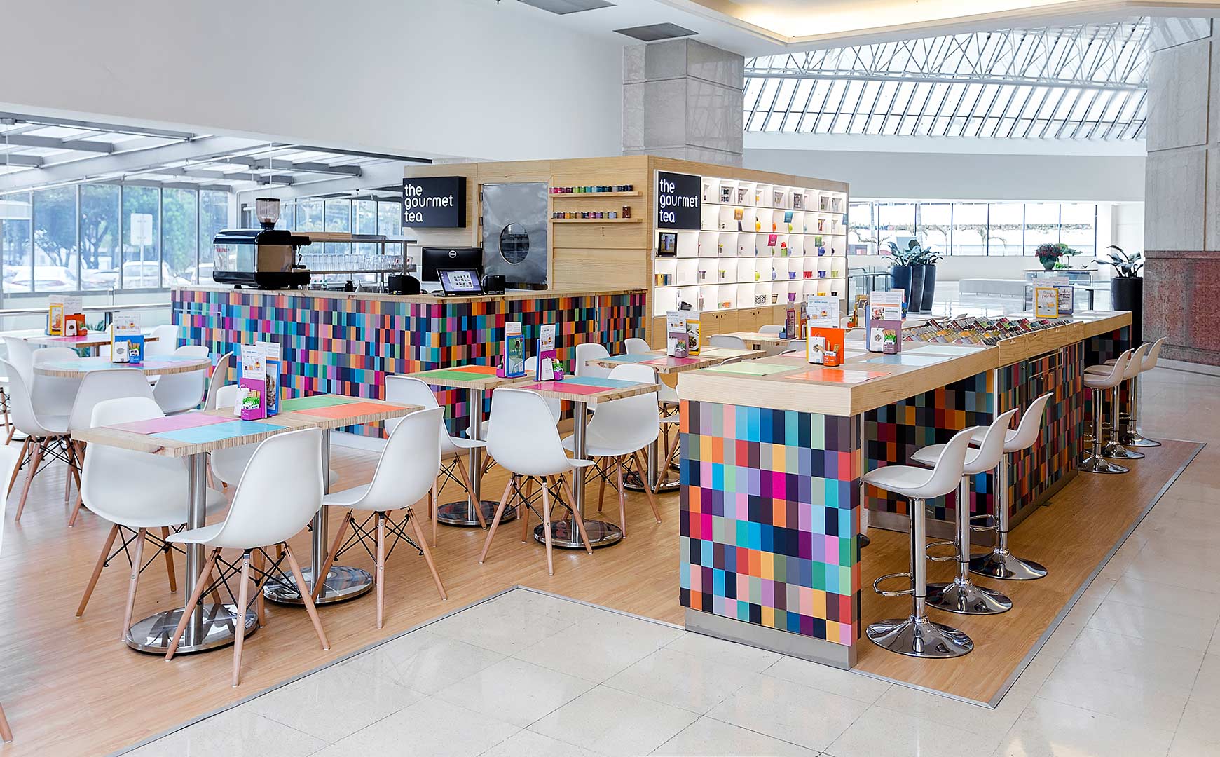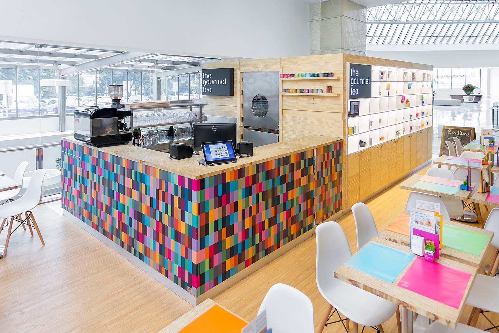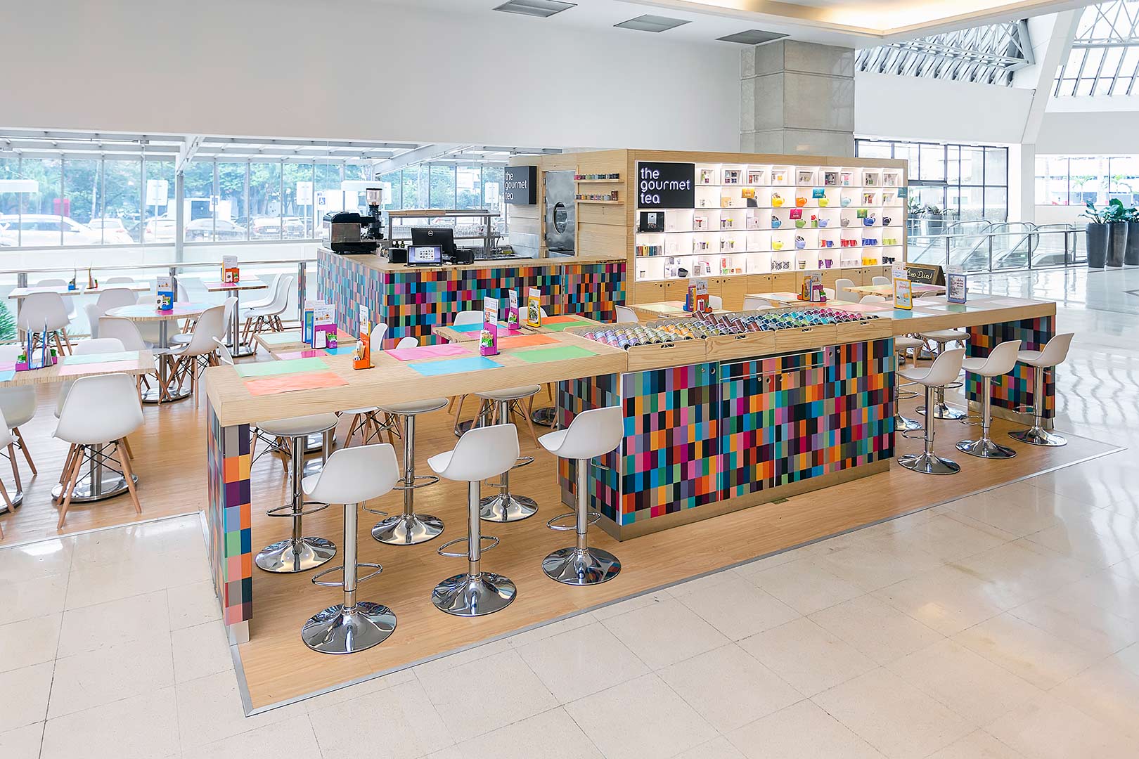 Descrição: Quiosque produzido em Madeira Pinus e Compensado Naval. Piso elevado área cozinha industrial com manta vinílica e rodapé arredondado, parte externa PVC vinílico com aplicação direto no piso. Possui mesas em compensado com design diferenciado dos tampos em tiras de compensado feitas pelo topo da madeira e pés cromados, cadeiras brancas com pés em madeira clara e banquetas brancas com pés cromados. Cozinha industrial com equipamentos, bancadas, prateleiras e paredes em aço inox escovado. Comunicação visual com adesivos coloridos conforme a marca e testeiras em MDF preto usinado a laser e acrílico branco 10mm usinado a laser encaixado em madeira. Iluminação indiretas por fitas de LED em nichos externos.