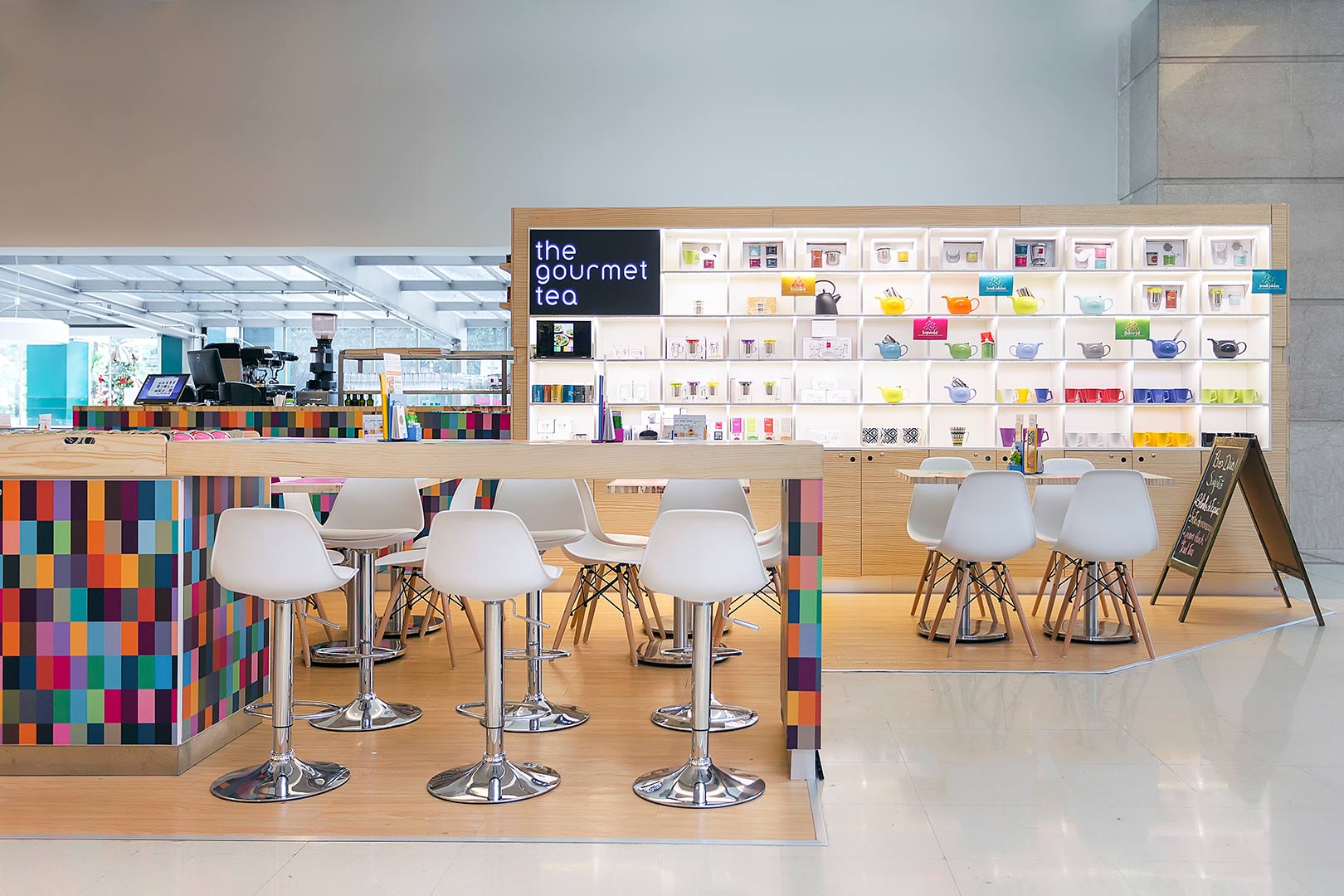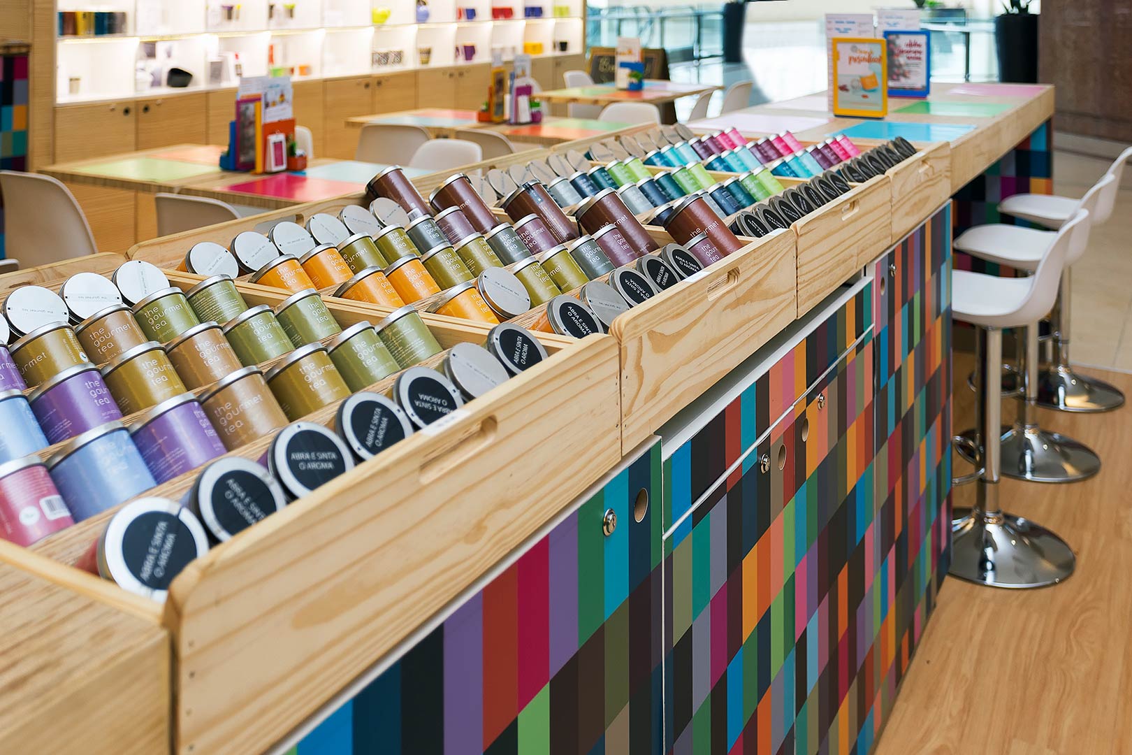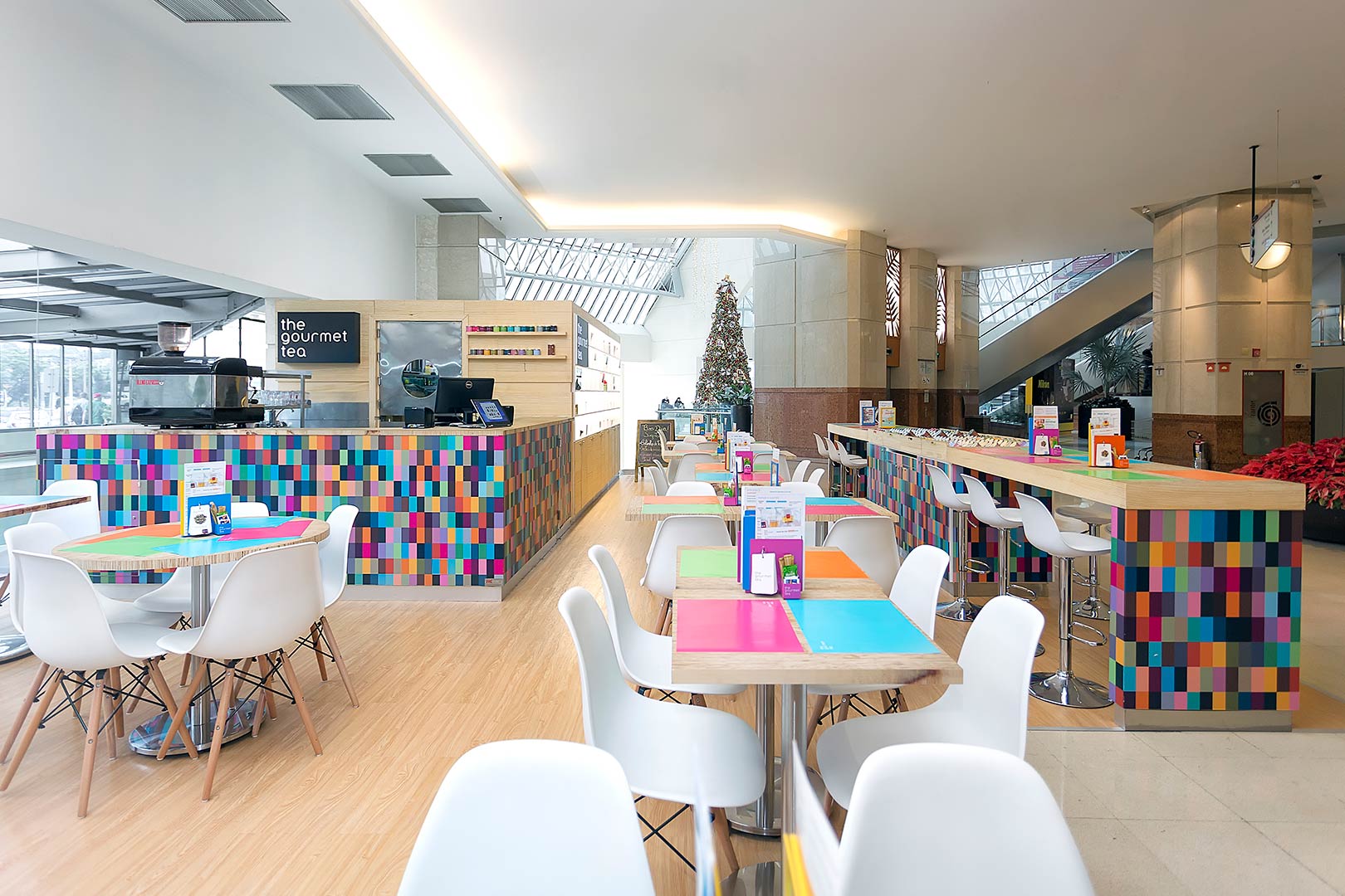 Descrição: Quiosque produzido em Madeira Pinus e Compensado Naval. Piso elevado área cozinha industrial com manta vinílica e rodapé arredondado, parte externa PVC vinílico com aplicação direto no piso. Possui mesas em compensado com design diferenciado dos tampos em tiras de compensado feitas pelo topo da madeira e pés cromados, cadeiras brancas com pés em madeira clara e banquetas brancas com pés cromados. Cozinha industrial com equipamentos, bancadas, prateleiras e paredes em aço inox escovado. Comunicação visual com adesivos coloridos conforme a marca e testeiras em MDF preto usinado a laser e acrílico branco 10mm usinado a laser encaixado em madeira. Iluminação indiretas por fitas de LED em nichos externos.